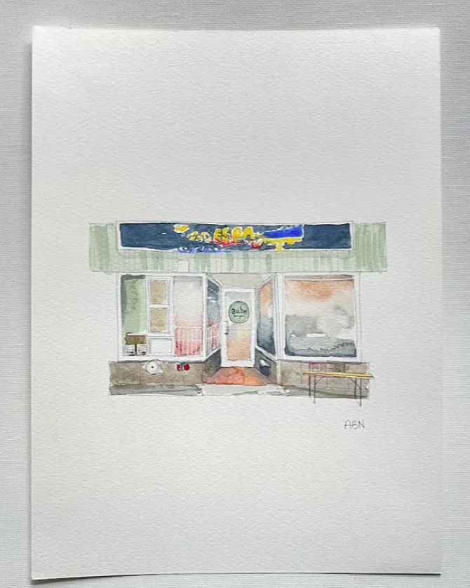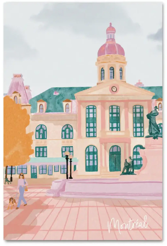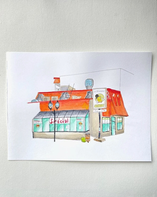 Enfin, l’artiste Andréanne B. Nolet, qui offre ses œuvres sur sa boutique Etsy, propose un regard coloré sur le quartier qu’elle habite. Sous ses pinceaux, Hochelaga prend vie de manière ludique. Parmi ses plus récentes créations, on trouve des institutions du quartier comme l’Atomic Café, La Pataterie et Aube Boulangerie.