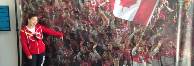 5. Après la cérémonie d’ouverture, l’équipe de soutien des édifices appartenant au Canada a fait faire une murale de l’équipe entrant dans le stade. Et c’est ma tite face qu’on voit en avant !